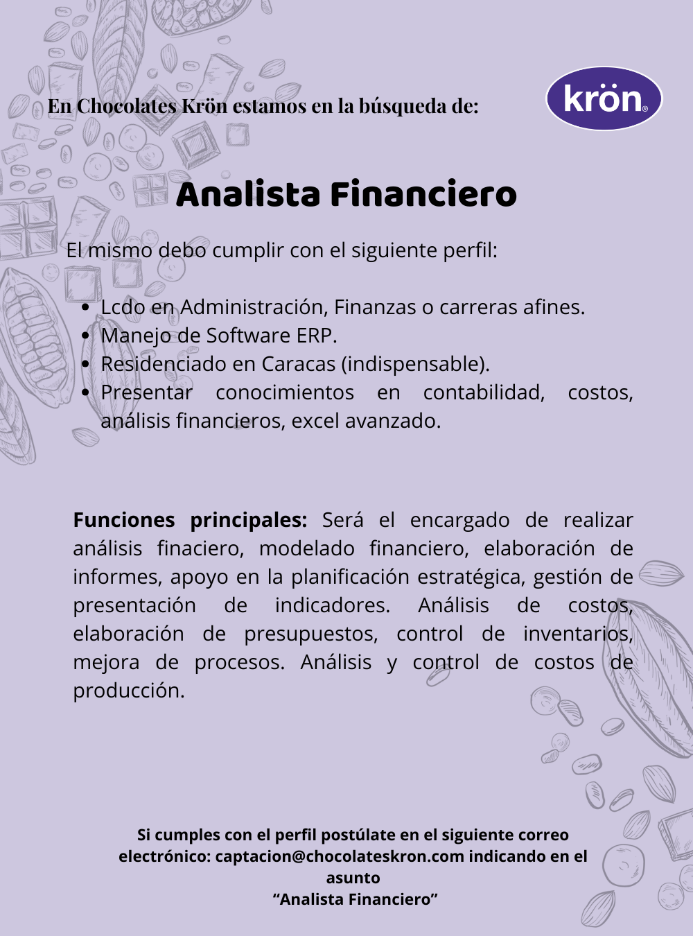 Habilidades: Conocimientos avanzados en finanzas, Excel y herramientas de análisis de datos, capacidad de comunicación y presentación, pensamiento estratégico, gestión y presentación de indicadores.